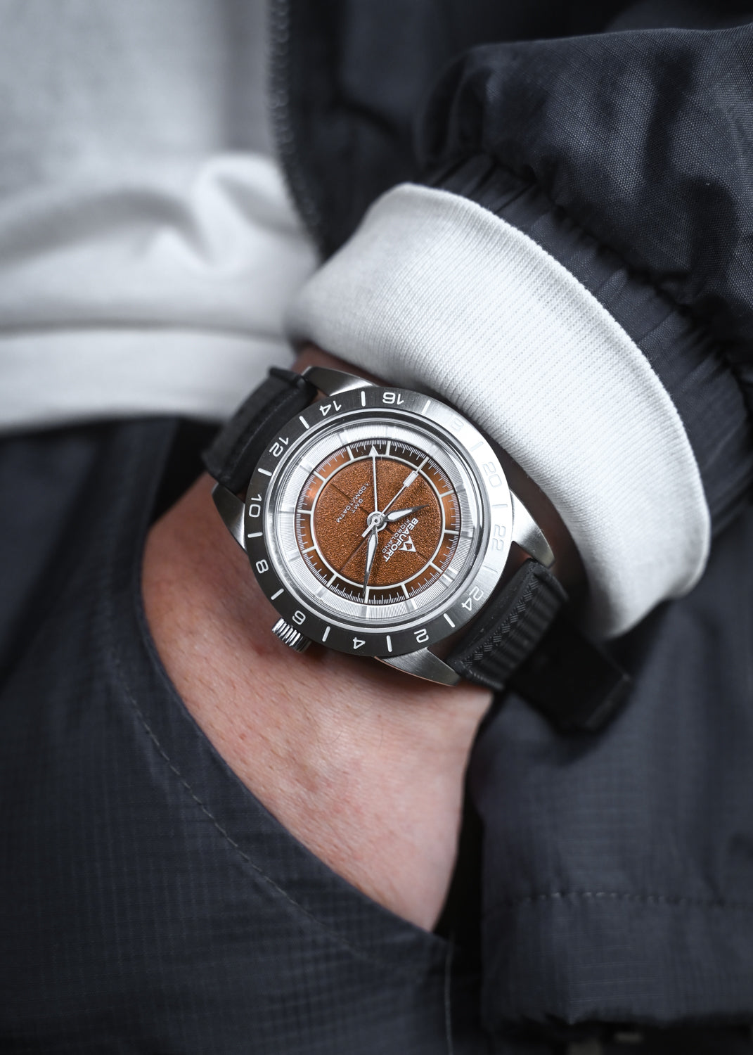 Powered by the proven Miyota 9075 automatic movement, this is a True GMT—allowing you to independently adjust the local hour hand while keeping track of home time. Whether you're crossing time zones or tracking a second location, precision is always at your fingertips.