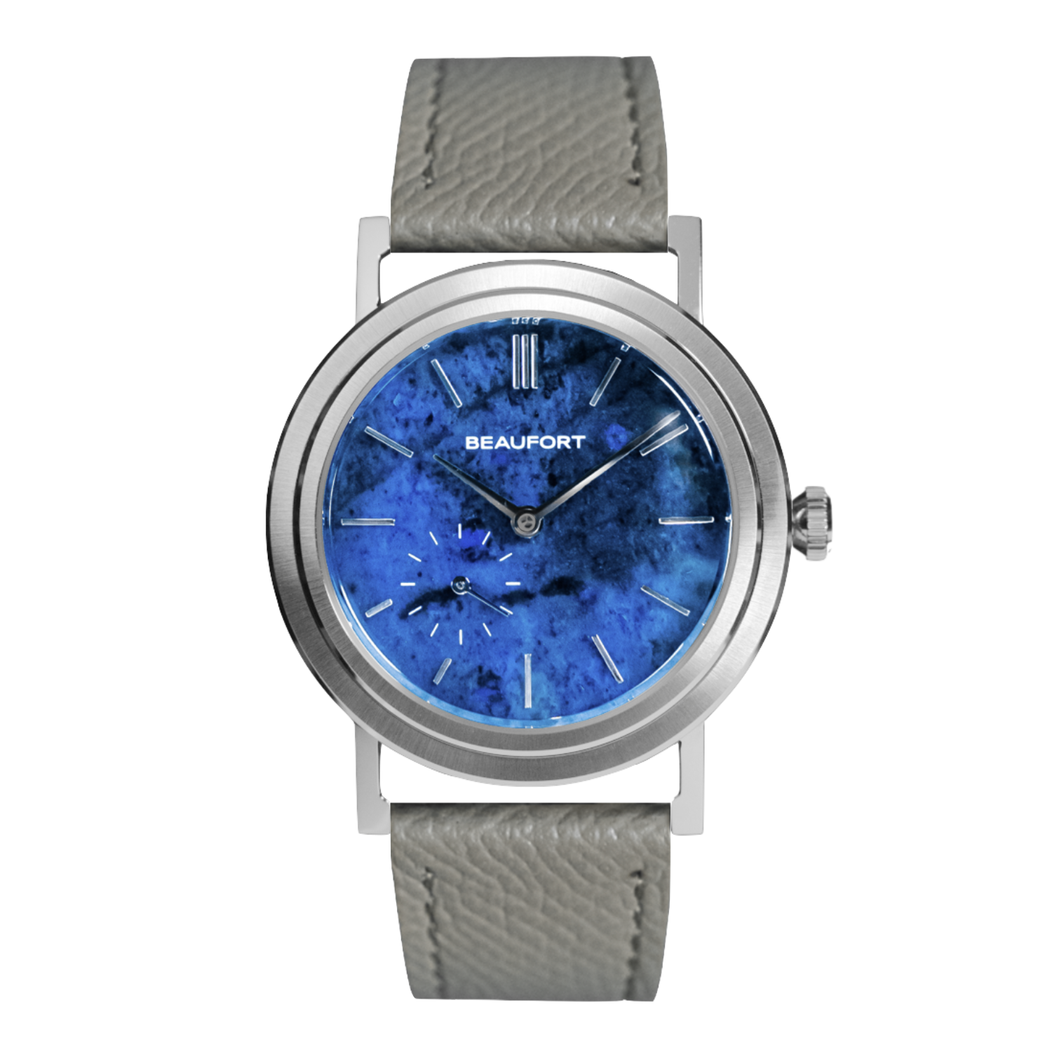 Each dial is cut from natural stone, with unique grain and depth that makes every watch a true one-off. Applied indices and polished hands are carefully proportioned for clarity against the textured surface.